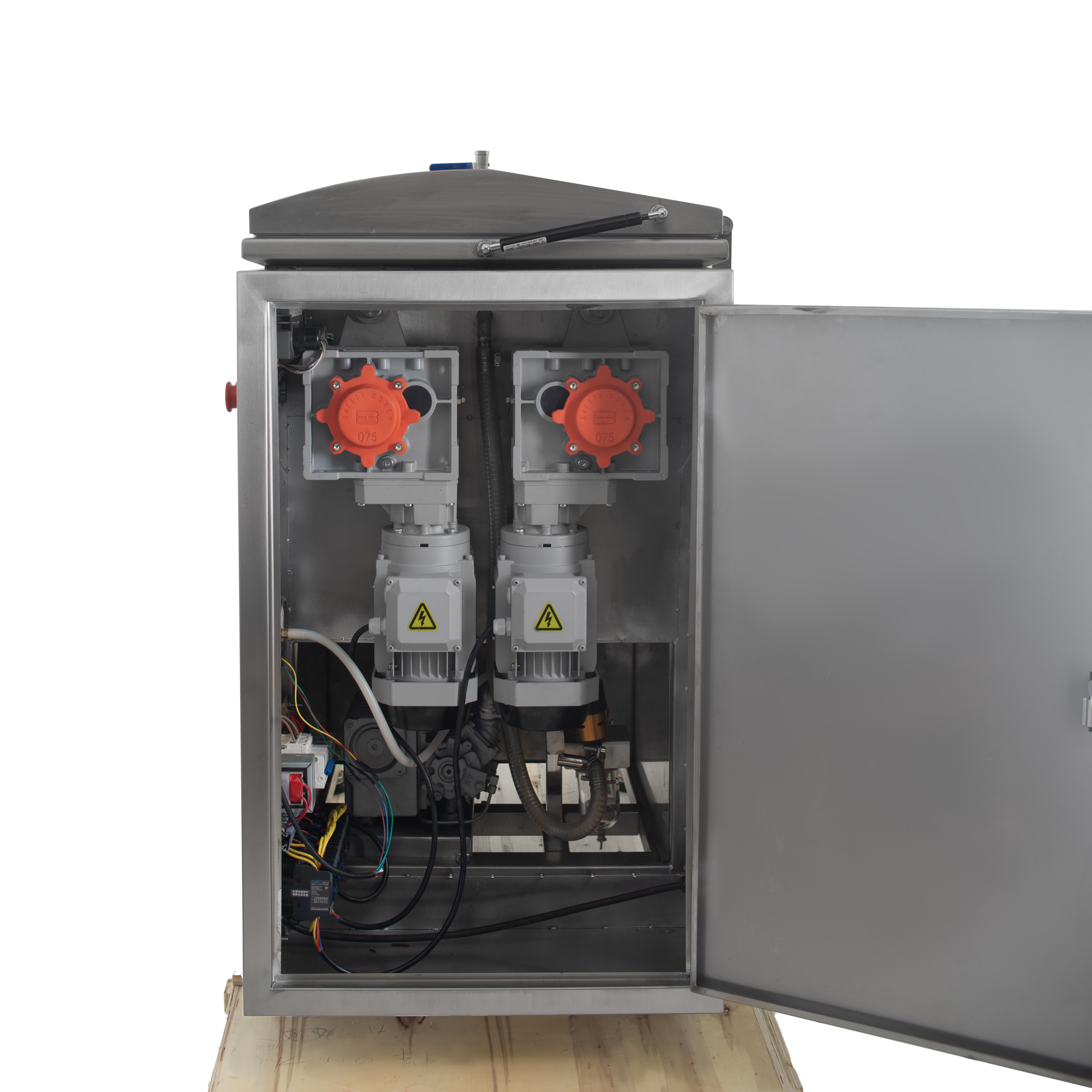 Система позволяет добиться равномерного перемешивания в течение 20 минут. При этом время вакуумации составляет 2 минуты. Оборудование с ручным типом загрузки и без функции подъема опрокидывания дежи не вызывает сложностей при использовании. Ручная разгрузка дает возможность контролировать качество перерабатываемого продукта.