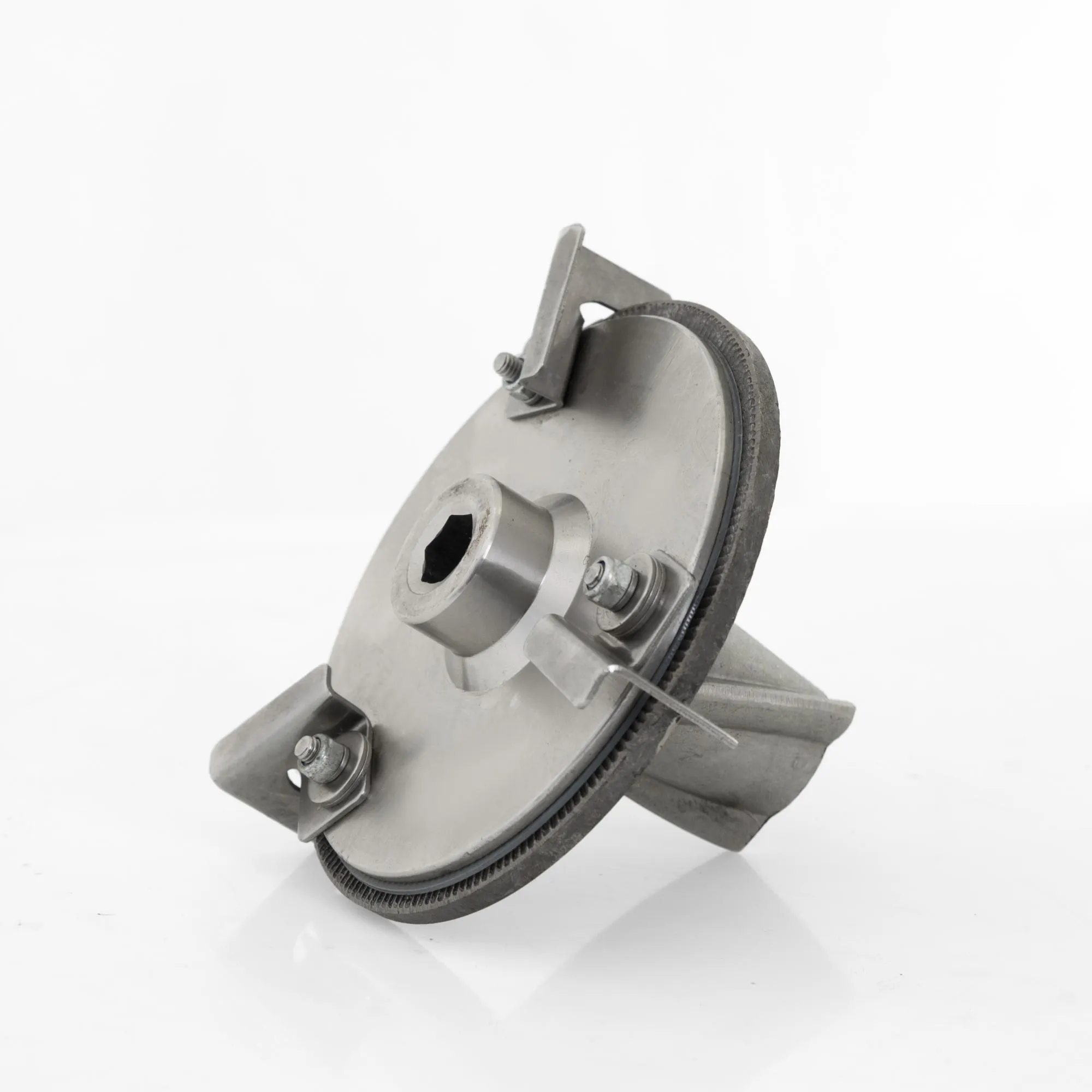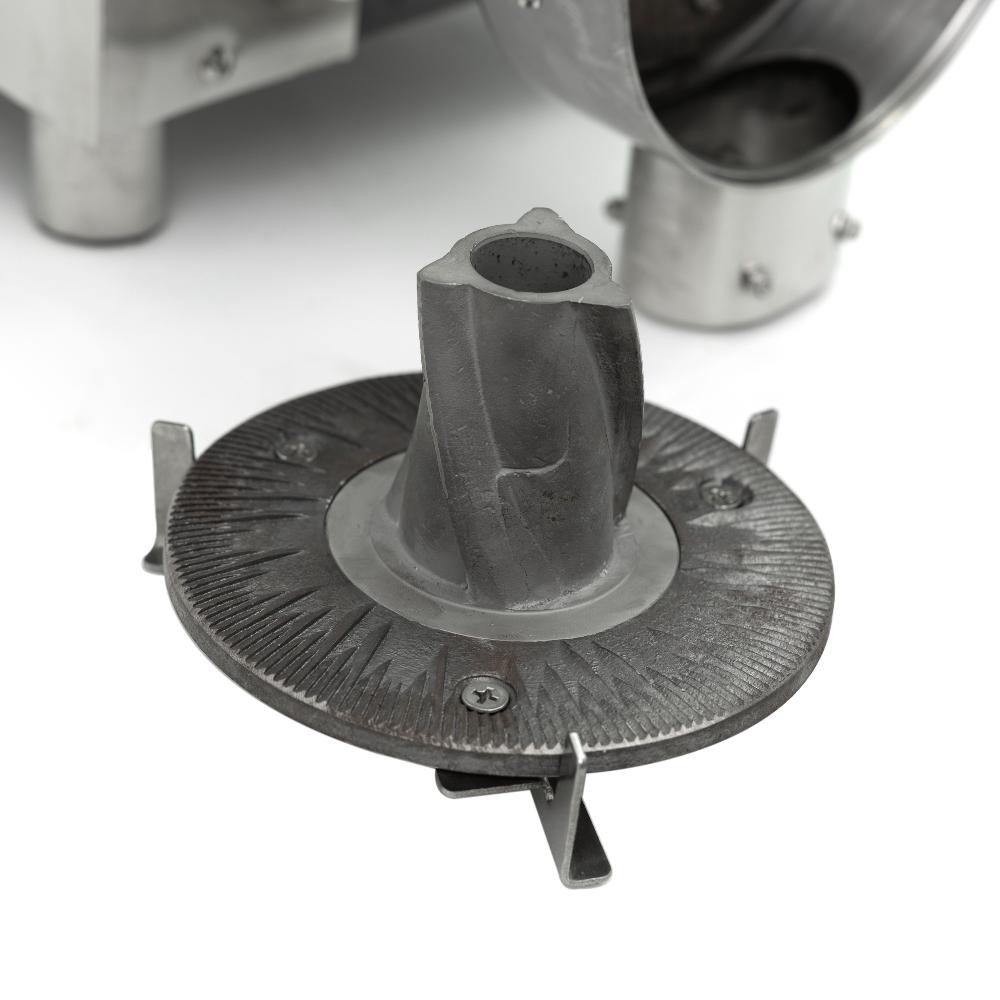 - Надёжные чугунные жернова и защита от металлических частиц. Рабочие диски изготовлены из литого чугуна, устойчивого к износу, и имеют вогнутую форму для эффективного захвата продукта. Выходной патрубок оснащён четырьмя неодимовыми магнитами, которые улавливают случайные металлические включения, предотвращая их попадание в готовый продукт.